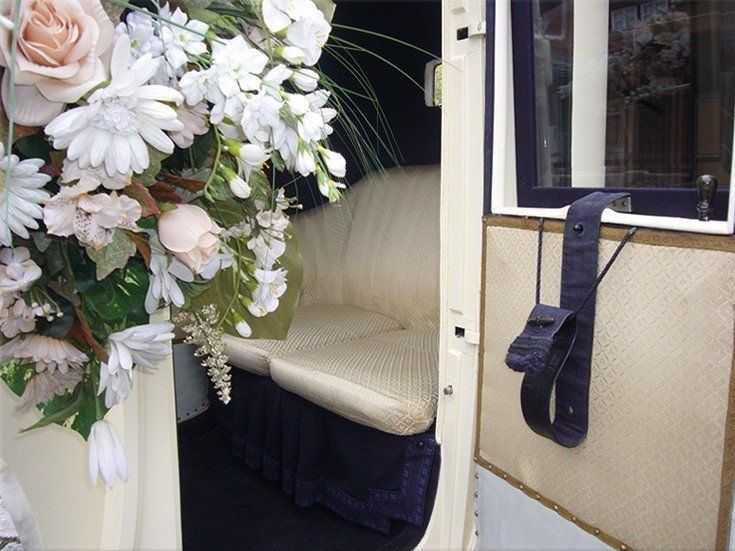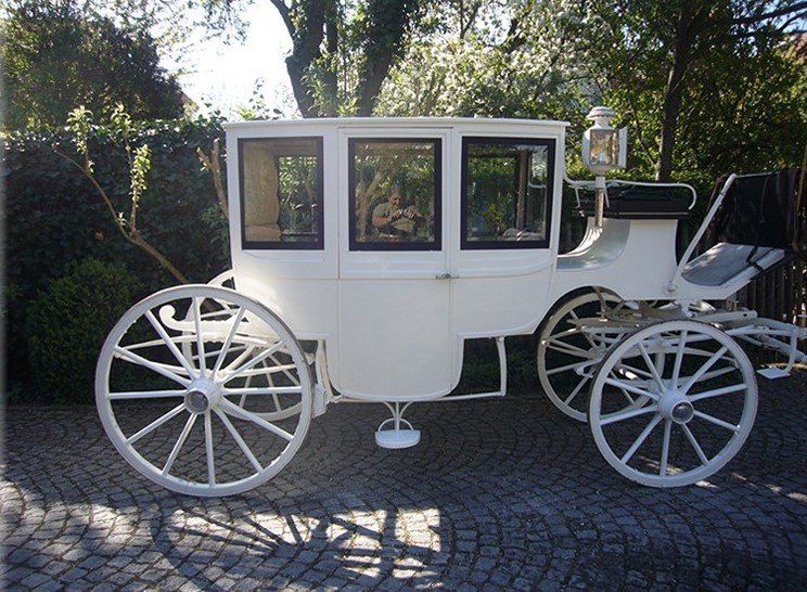 Unsere weißen Hochzeitskutschen sind geschlossen, mit Scheiben aus geschliffenem Glas. Die Fenster in den Türen lassen sich öffnen; sie können mit Hilfe von breiten, schweren Stoffbändern im Türblatt versenkt werden. Alle unsere Kutschen wurden um 1900 gebaut und werden von uns mit liebevoller Sorgfalt instand gehalten. Die Hochzeitskutschen werden zweispännig gefahren.